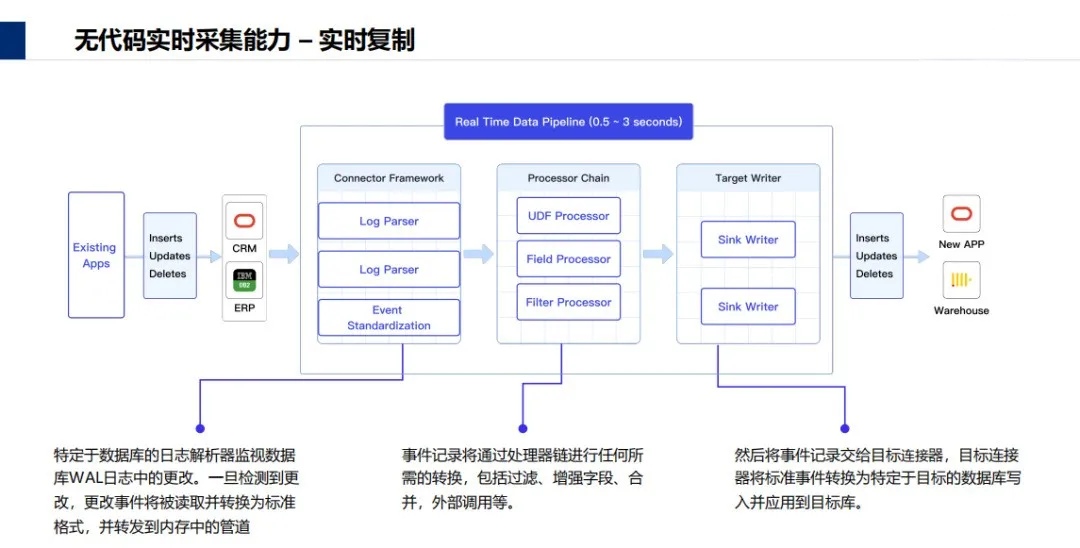 实时采集能力也称为 CDC 机制,简单对该机制进行分析。左边是业务源系统,前面有业务应用,但不直接对接业务应用,因为无代码可低成本快速接入,只需要数据库账号,就会监听数据库的日志文件,把数据事件采集、分析,标准化成事件流,经过连锁处理。可以使简单的字段改名、改值或者是用 Python / Javascript 对数据进行自定义的加工,用目标连接器写到指定目标的数据库里,这是无代码采集能力的机制,整个过程部署完后,只需给到账号权限就可以完成数据链路的搭建。