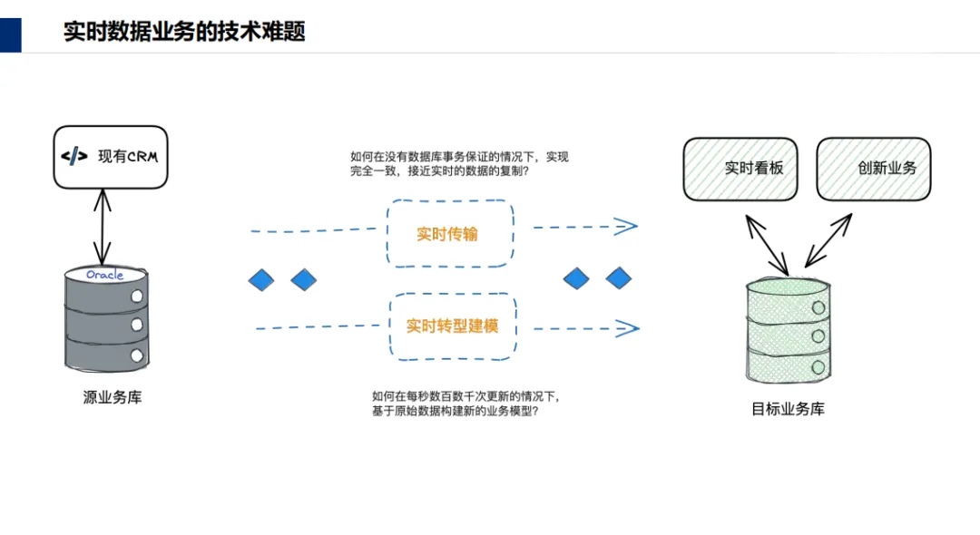 以上场景都需要数据的产生和使用,一个是源头,另一个是在新的场景使用,不是在源系统上做,要在新的地方做新业务,问题难点在于怎样在不改变运行多年系统的基础上做创新,涉及到数据要从已有的业务系统中实时传输到新库里,客户交互业务,要确保数据是准确的、一致的。但是因为异构分库是两套系统,在没有数据库事务的保证基础上达到数据准确是非常困难的事。新业务使用的模型要通过预计算的方式才能真正有效。这涉及到对数据在变化、采集时,实时地把它建成想要的业务模型。这两项技术在近几年都在尝试解决,但还没有前沿的解决方案,因为技术上确实比较困难。