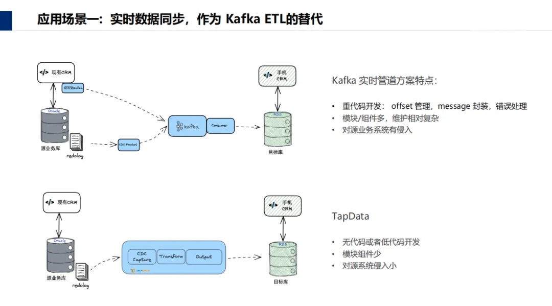 主流的数据同步,现在多用 Kafka ETL ,用来做数据管道。用 Kafka 会涉及到几个模块,改写源端的业务应用,写 consumer 代码,采用 CDC 工具,要两三个方案合在一起才能解决问题,是个非常重开发的业务方案,对源系统也会侵入。TapData 方案是透明的,从已有库里采集增量日志,直接放到想要的地方,完成点对点。
