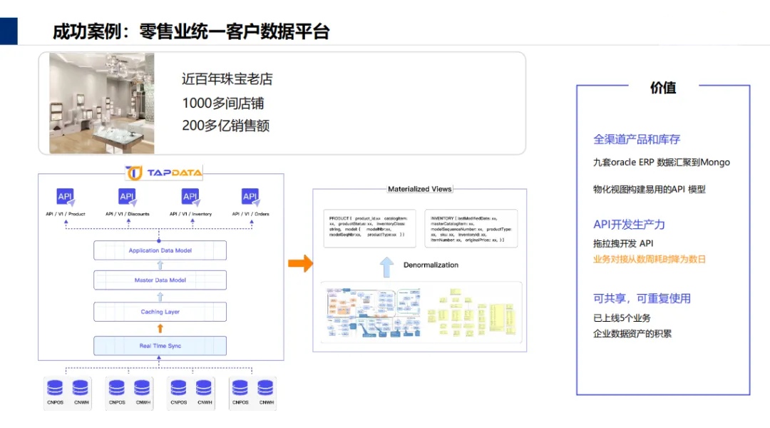 以某珠宝零售品牌为例:有核心数据、商品数据、库存数据、客户数据、订单数据,分布在 9 套业务系统支撑门店运行。该品牌希望能有准时的、完整的、准确的系统,供总部知晓整个的商品的信息、库存状态等等。之前他们用 MQ 的方式,但很难管理、容易出错、没有统一监控、无法排查问题原因。利用无缝无代码方案把9套系统集成,在这过程中还形成了直观自然的模型,可以看到完整的商品信息,把属性加工处理好,快速配置API,一天之内给发布到测试环境,交给研发使用,效率提升非常明显。API 的开发生产力从以前的两三个月降到了一两周,流程上需要不断测试,再推到生产场景。那另外最核心的点,是终于有了全渠道商品平台,可交付给前端业务团队拿到所有数据。最大的特点是可以共享、重复使用。