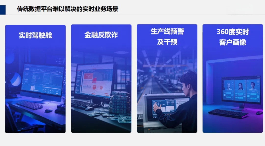 什么类型的业务是实时业务场景,跟传统的业务系统有什么区别。我们说的业务,涉及到已有系统之外,利用企业的数据做新的事情,比如说实时驾驶舱等都在企业内常见的,便于让管理层第一时间了解企业情况。实时数据的获取和使用对此非常重要。