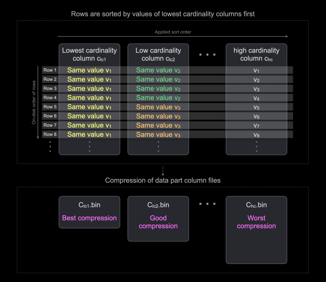 如果数据具有一定的模式,通用压缩编解码器如 LZ4 和 ZSTD 可以实现最高的压缩率。例如,连续相同值的长序列通常能很好地压缩。通过按列值排序行,可以实现这样的长序列,从最低基数列开始。下图对此进行了说明: