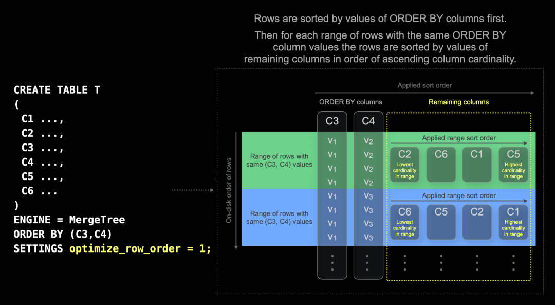 通过新的 optimize_row_order 设置,ClickHouse 自动实现最佳数据压缩。ClickHouse 仍然按 ORDER BY 列排序在磁盘上存储行。此外,在具有相同 ORDER BY 列值的行范围内,按剩余列的值进行排序,这些列按范围内列基数升序排列: