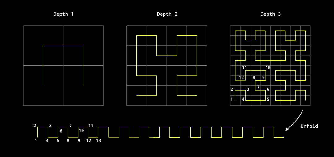 空间填充曲线是一种连续曲线,可以经过给定多维空间内的每一个点,通常在一个单位平方或立方体内,从而完全填充空间。这些曲线对很多人来说都非常吸引人,主要是因为它们挑战了我们直觉中一维线条无法覆盖二维区域或更高维体积的想法。最著名的例子包括 Hilbert 曲线和较早期的 Peano 曲线,二者都是通过迭代方式增加在空间内的复杂性和密度。空间填充曲线在数据库中有实际应用,因为它们能够有效地将多维数据映射到一维,同时保持局部性。