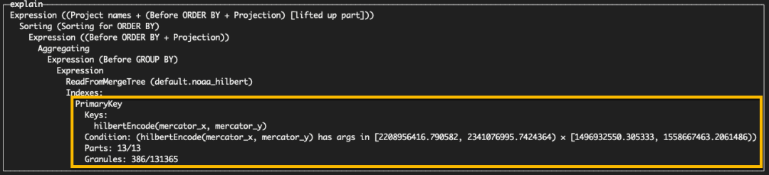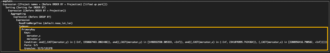 我们可以看到,通过使用 EXPLAIN indexes=1 子句,这个键在过滤颗粒方面相对有效,将读取的颗粒数减少到 5172。