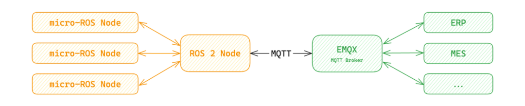 这是一个典型的 micro-ROS 的应用场景:在一个包含多个机器人的系统中,一个主控制节点运行 ROS 2,负责高级任务调度和决策,而每个机器人各自运行一个 micro-ROS 节点,负责执行更低级别的任务,例如与传感器直接通信,以及驱动运动部件。