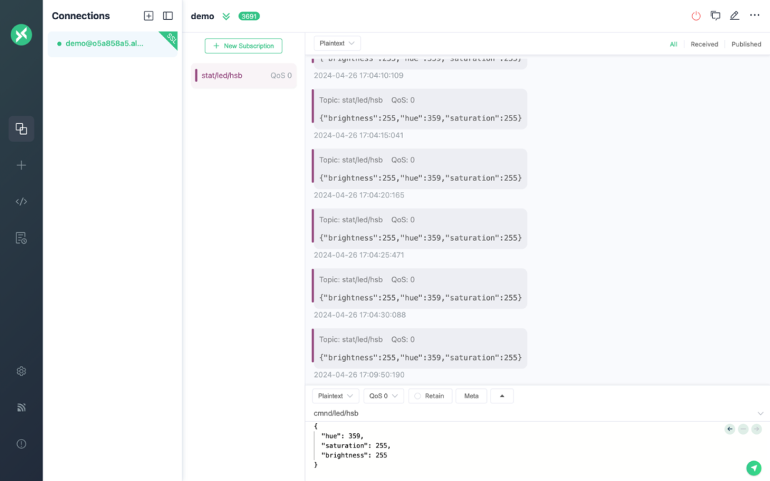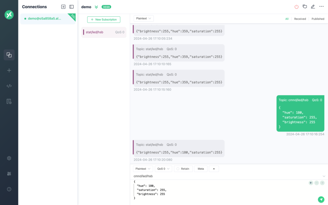 cmnd/led/hsb发布指令,来更改 ESP32 开发板上 LED 的色调、饱和度和亮度: