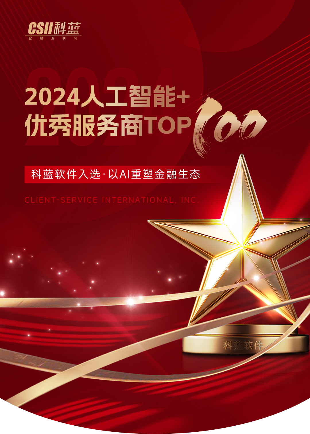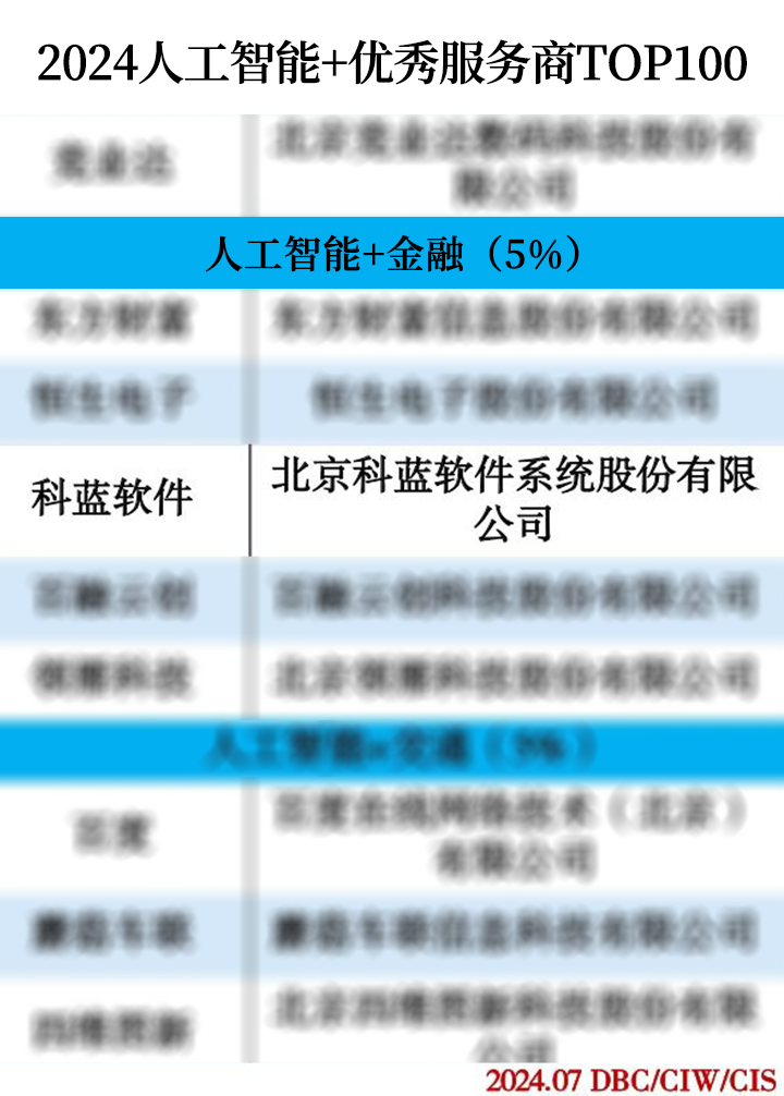 近日,在中国人工智能市场蓬勃发展的浪潮中,科蓝软件凭借其在数字金融领域的卓越贡献与创新实力,成功入选由中国科学院《互联网周刊》、中国社会科学院信息化研究中心、eNet研究院、德本咨询联合发布的“2024人工智能+优秀服务商TOP100”排行榜,并在人工智能+金融赛道上脱颖而出,荣获优秀服务商称号。