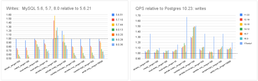 MySQL的性能随版本更新而逐步衰减,但在同样的性能回归测试中,PostgreSQL 性能却可以随版本更新有着稳步提升。特别是在最关键的写入吞吐性能上,最新的 PostgreSQL 17beta1 相比六年前的 PG 10 甚至有了 30% ~ 70% 的提升。