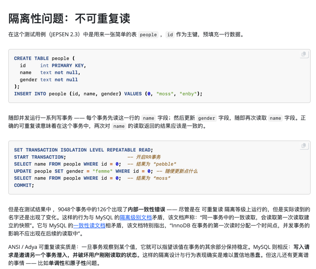 权威的分布式事务测试组织 JEPSEN[24] 研究发现,MySQL 文档声称实现的 可重复读/RR 隔离等级,实际提供的正确性保证要弱得多 —— MySQL 8.0.34 默认使用的 RR 隔离等级实际上并不可重复读,甚至既不原子也不单调,连 单调原子视图/MAV 的基本水平都不满足。