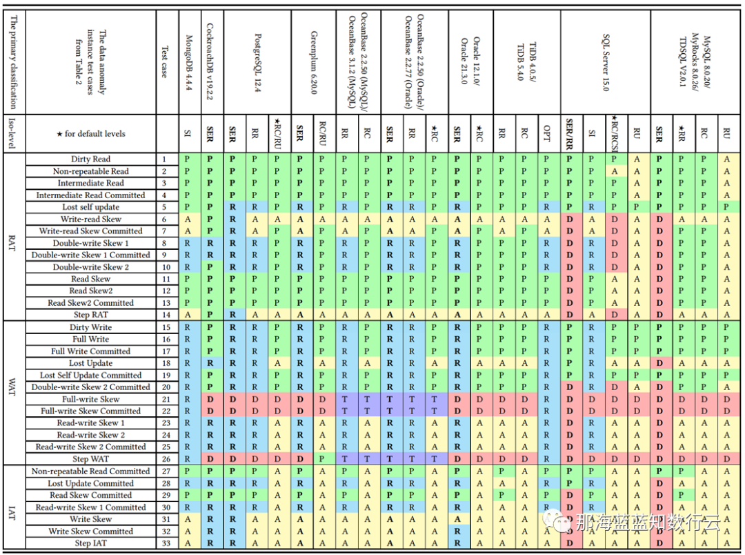 李海翔教授在《一致性八仙图》论文中,系统性地评估了主流 DBMS 隔离等级的正确性,图中蓝/绿色代表正确用规则/回滚避免异常;黄A代表异常,越多则正确性问题就越多;红“D”指使用了影响性能的死锁检测来处理异常,红D越多性能问题就越严重;不难看出,这 MySQL 出现了大面积的黄A与红D,正确性水平与实现手法糙地不忍直视。