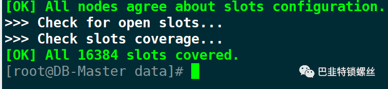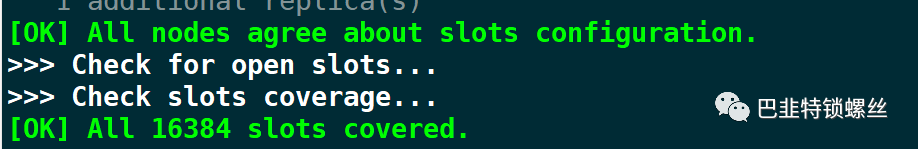 [root@DB-Master data]# usr/local/redis/bin/redis-cli -a 123456 --cluster check 192.168.1.137:6371Warning: Using a password with '-a' or '-u' option on the command line interface may not be safe.# 主节点信息192.168.1.137:6371 (694ce7e6...) -> 0 keys | 5461 slots | 1 slaves.192.168.1.137:6372 (bc13ea49...) -> 0 keys | 5462 slots | 1 slaves.192.168.1.137:6373 (7a87ed79...) -> 0 keys | 5461 slots | 1 slaves.# 主节点有多少 Key[OK] 0 keys in 3 masters.# 每个槽的平均分配情况0.00 keys per slot on average.# 集群状态检查操作由 192.168.1.137:6371执行>>> Performing Cluster Check (using node 192.168.1.137:6371)# 主节点信息以及附加的从节点个数M: 694ce7e6fd614fe4da0590e56f82ac9307229835 192.168.1.137:6371slots:[0-5460] (5461 slots) master1 additional replica(s)# 从节点信息以及复制的主节点 IDS: 8de2b7f096636e2fa7ef66aae72e0c50ebbff0bb 192.168.1.137:6375slots: (0 slots) slavereplicates 7a87ed79be4ec0023ea9a93774e4eb136dfe99c7S: bdda13fdf3c1f39b4d9c1e6148a15028f45e8fa4 192.168.1.137:6374slots: (0 slots) slavereplicates bc13ea49343fcdf80cbee55b263d5d925d46bdc7M: bc13ea49343fcdf80cbee55b263d5d925d46bdc7 192.168.1.137:6372slots:[5461-10922] (5462 slots) master1 additional replica(s)S: d05f960dd0f0e2688d2f2191aef1b94c2f66ba9c 192.168.1.137:6376slots: (0 slots) slavereplicates 694ce7e6fd614fe4da0590e56f82ac9307229835M: 7a87ed79be4ec0023ea9a93774e4eb136dfe99c7 192.168.1.137:6373slots:[10923-16383] (5461 slots) master1 additional replica(s)# 所有节点都同意槽的配置情况[OK] All nodes agree about slots configuration.>>> Check for open slots...>>> Check slots coverage...# 所有 16384 个槽都包括在内[OK] All 16384 slots covered.