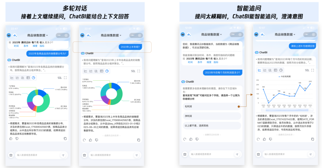 腾讯云 ChatBI 支持多轮对话和智能追问,当用户得到一份数据分析结果后可以紧接着继续提问,腾讯云 ChatBI 将结合上下文进行回答。当用户的提问较模糊时,腾讯云 ChatBI 能对模糊部分进行智能追问,充分理解意图后再进行回答。