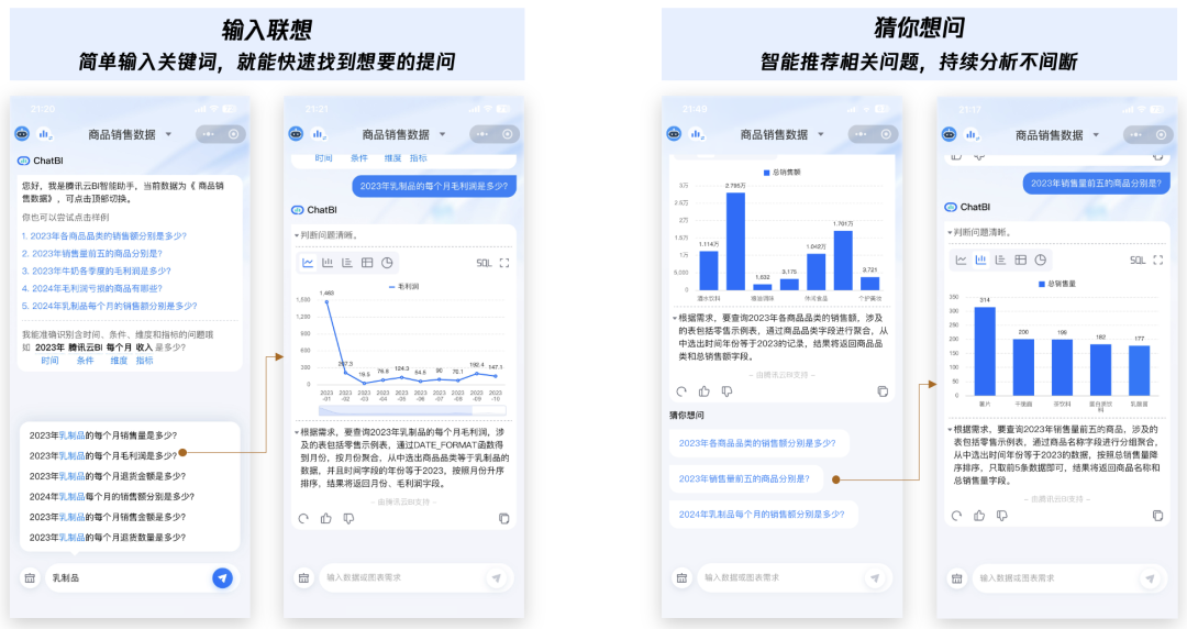 腾讯云 ChatBI 支持输入联想和猜你想问能力,能有效提升分析效率。输入联想可根据用户输入的关键词,快速联想相关问题进行推荐。猜你想问可根据用户当前提问智能推荐相关问题,让分析思路持续不间断。