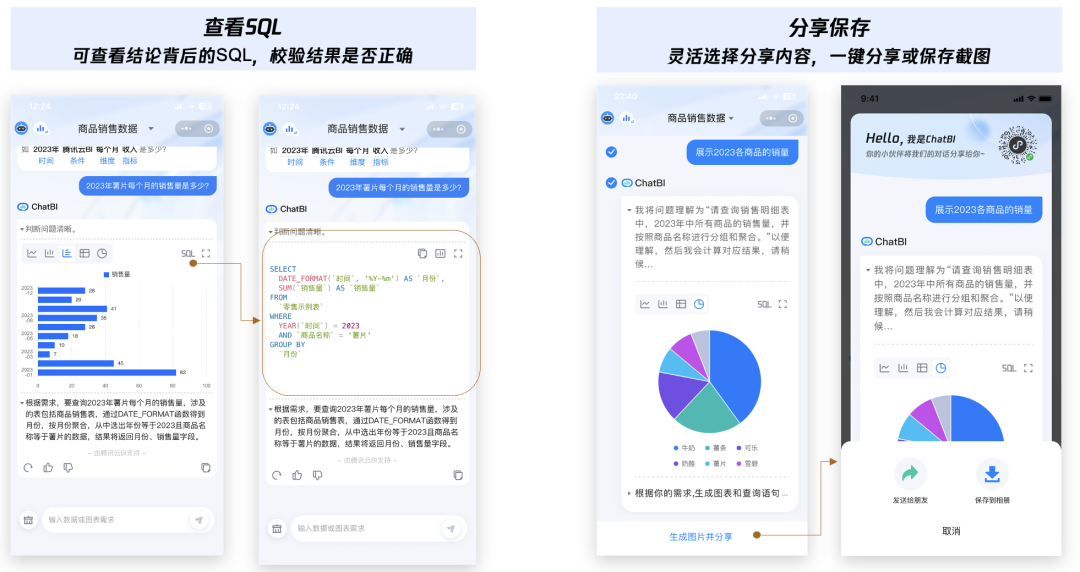 除了图表,腾讯云 ChatBI 还将返回图表结论背后的 SQL 语句,协助用户校验结果是否正确。如果图表结论需要分享,用户还可以灵活选择内容,一键生成分享图片并发送。