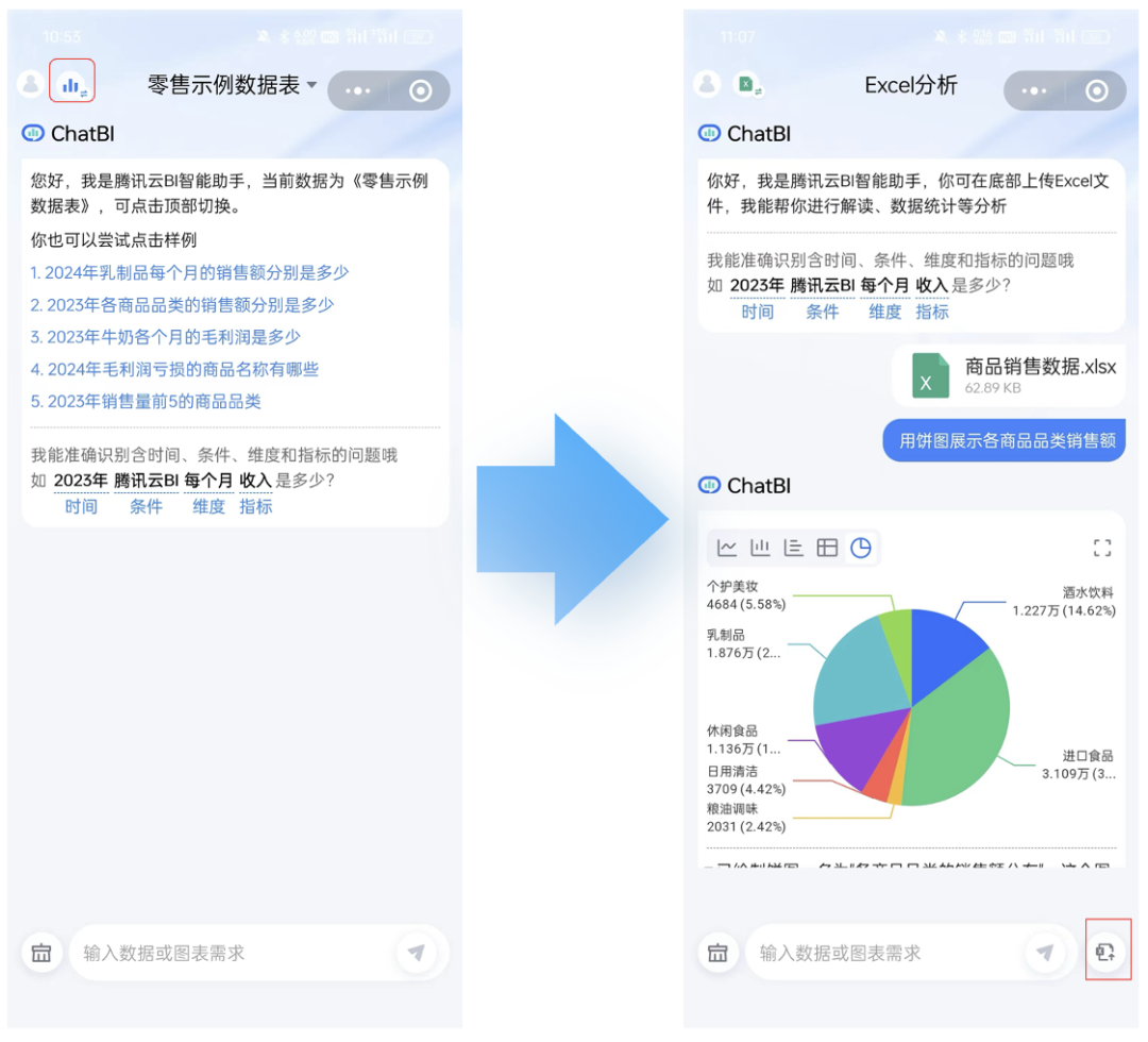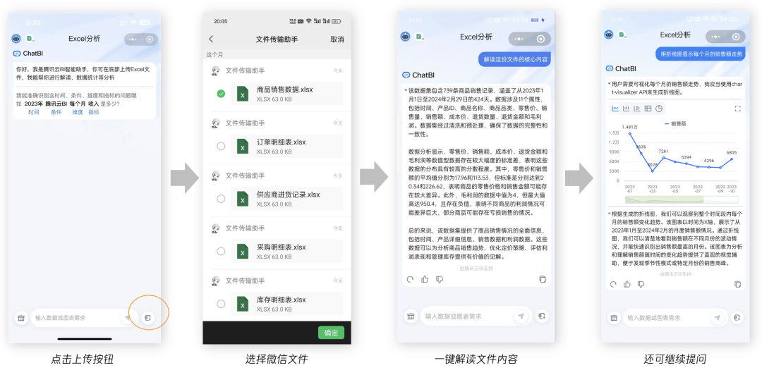 除了对数据表进行分析外,腾讯云 ChatBI 还支持从 Excel 文件导入,秒出分析结论,并支持继续提问刨根问底。有效满足小型企业的轻量化数据分析场景。