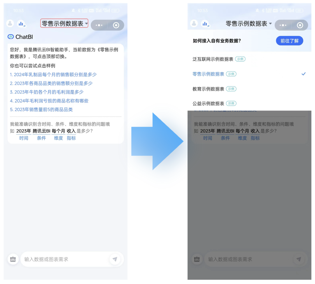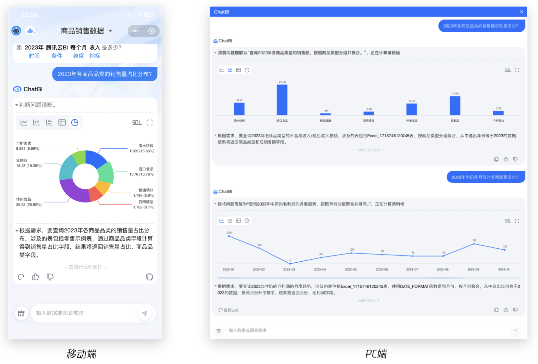 腾讯云 ChatBI 支持移动端(小程序/H5页面)、PC 端多个终端展示,能更好的满足不同角色、不同场景下的问数分析需求。