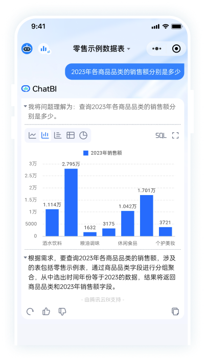 例如询问“ 2023 年各商品品类的销售额分别是多少”,腾讯云 ChatBI 能按商品品类进行分组聚合,并返回各商品品类的销售额。