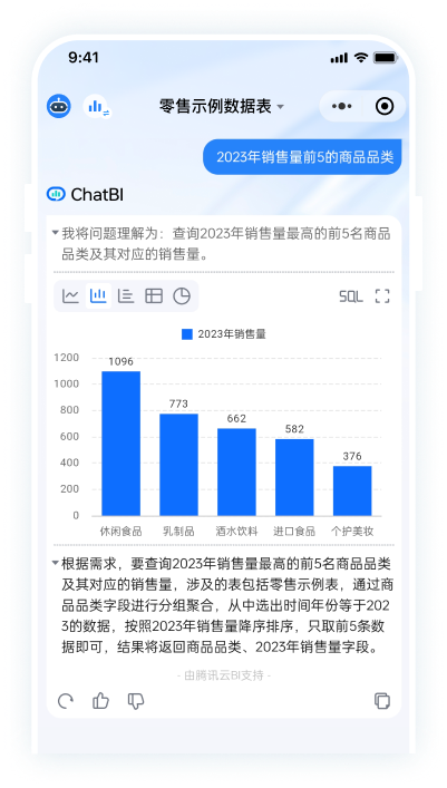 例如询问“ 2023 年销售量前5的商品品类”,腾讯云 ChatBI 能按商品品类进行分组聚合,并按销售量降序排序,返回排名前5的商品品类及其销售额。
