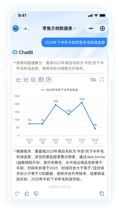 例如询问“ 2023 年下半年牛奶的各月毛利润走势”,腾讯云 ChatBI 能按月进行时间聚合,返回商品名称为牛奶的毛利润情况。