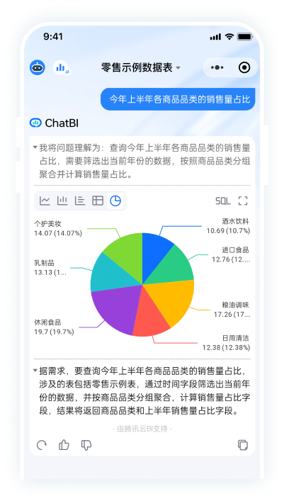 例如询问“今年上半年各商品品类的销售量占比”,腾讯云 ChatBI 能按商品品类进行聚合,并计算出每个商品品类的销售额占比,最终通过饼图进行展示。