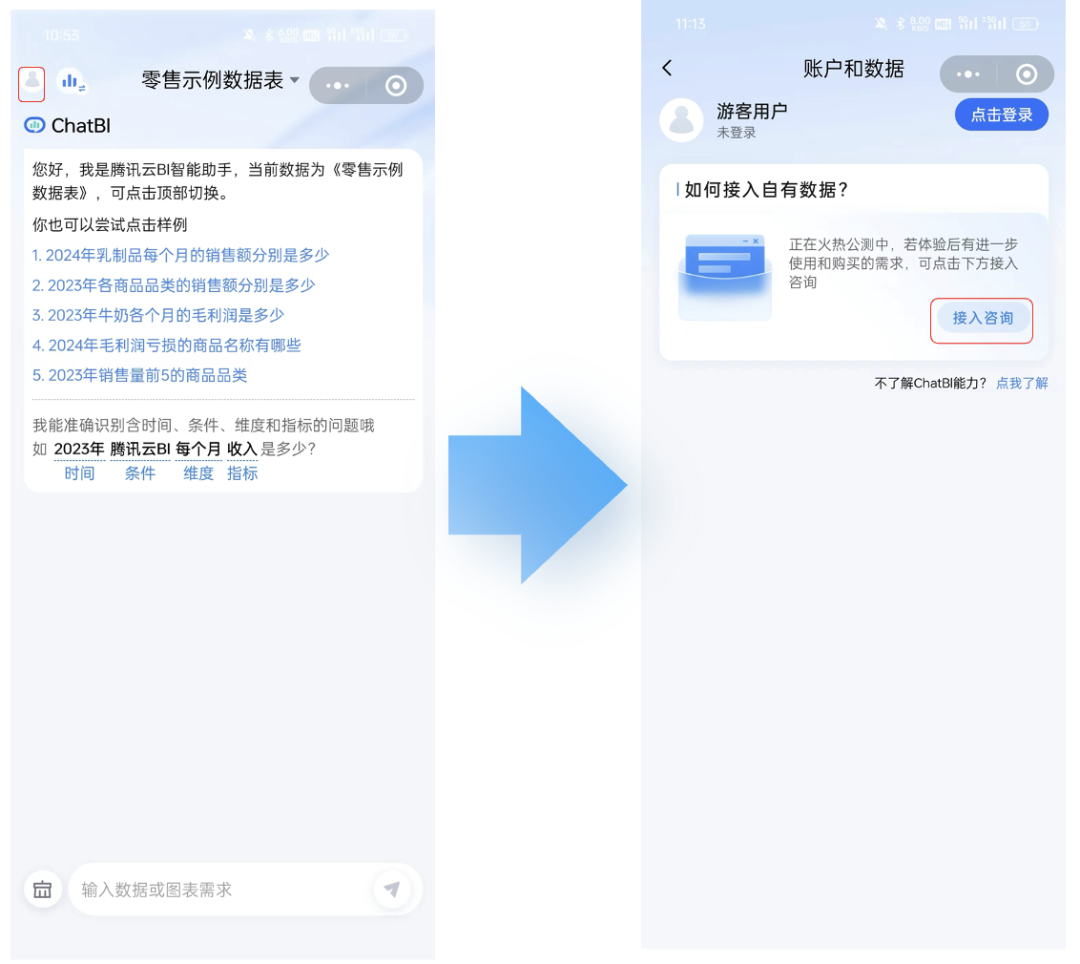 若您体验后有进一步接入自有数据使用的需求,欢迎点击小程序左上角,在账户页中点击“接入咨询”进行留资,资料审核通过后我们将会在近期联系您开通试用。