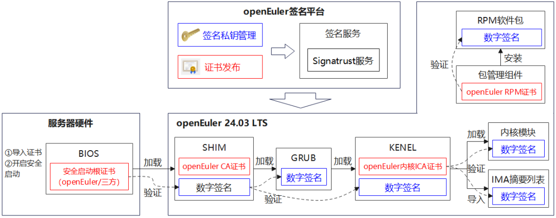 用户安装 openEuler 镜像后,开启安全启动、内核模块校验、IMA、RPM 校验等按机制,在系统启动和运行阶段使能相应的签名验证功能,保障系统组件的真实性和完整性。