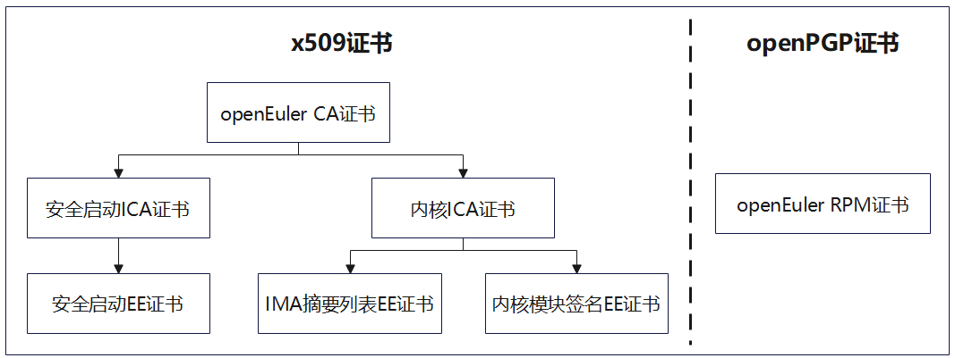 | 内核ICA证书 | x509二级证书 | 预置在openEuler内核中的根证书,用于签发及校验内核签名证书 |