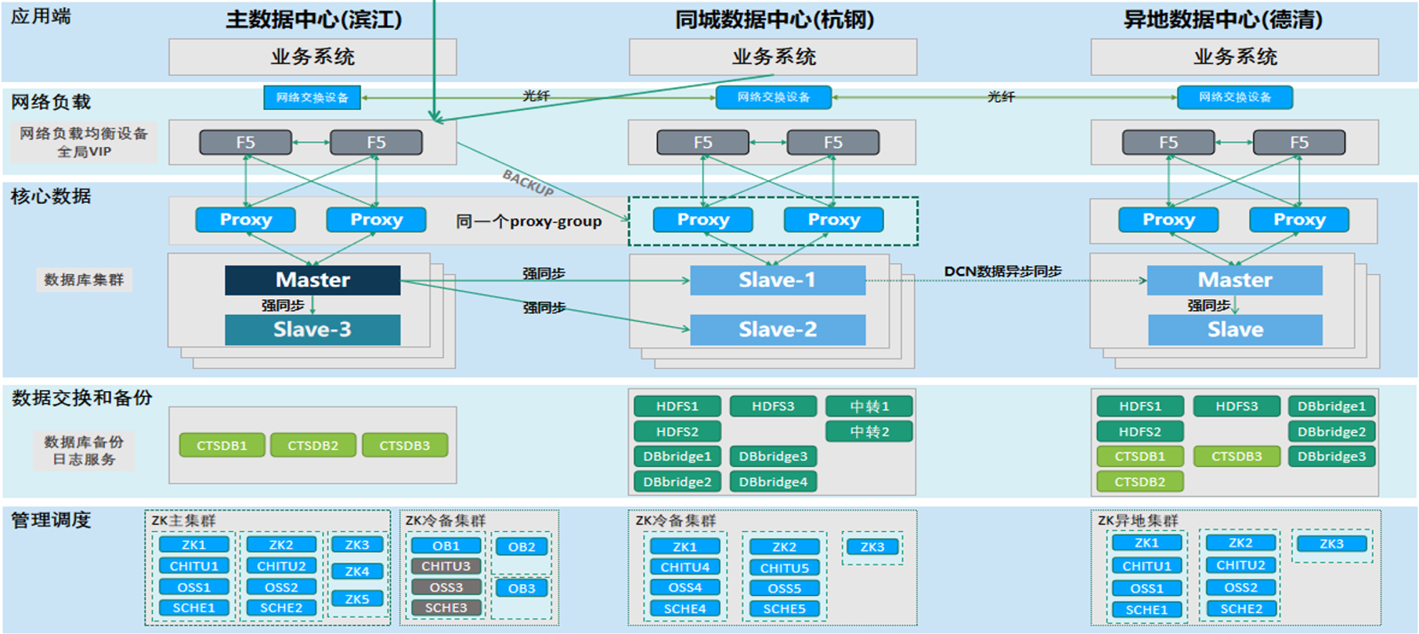 浙江农信在滨江机房、杭钢、德清均有数据中心,架构部署细节上采用两地三中心部署,数据库采用一主三备,同城中心间数据强同步,异地灾备机房采用 DCN 异步复制做实例间的数据同步,实现跨城灾备,支持中心级别灾难快速自动恢复,且数据零丢失。