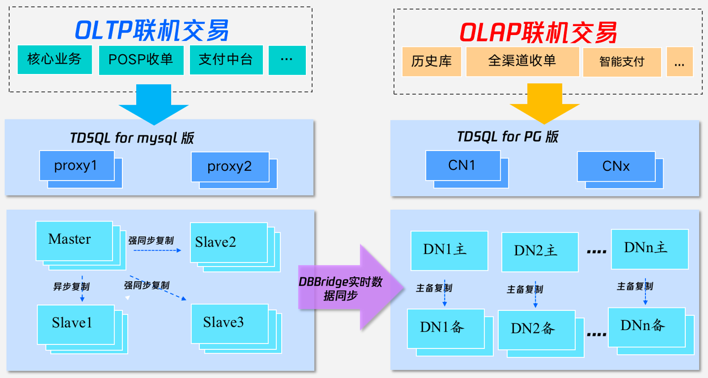 为了解决交易数据归档和聚合查询等场景,浙江农信将上游交易系统TDSQL数据库中的交易数据通过DBbridge实时同步到下游TDSQL数据库中。历史交易查询等场景均在TDSQL数据库中实现。