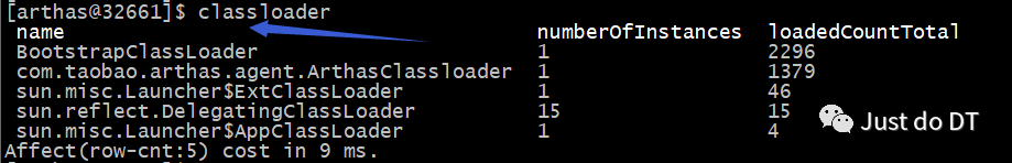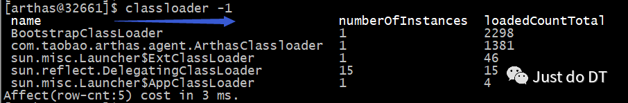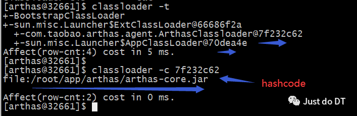 按类加载器的实例查看统计信息,可以看到类加载的hashCodeclassloader -l