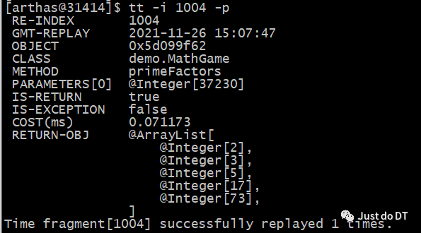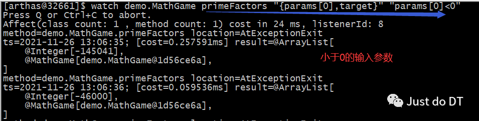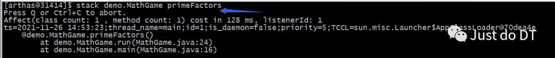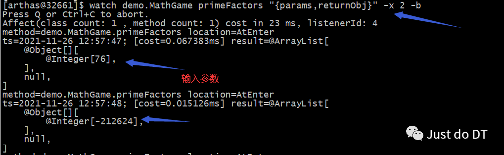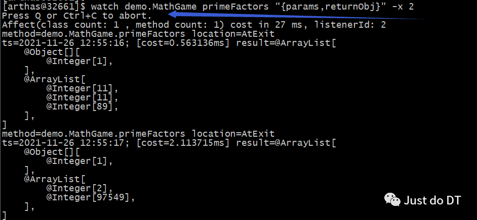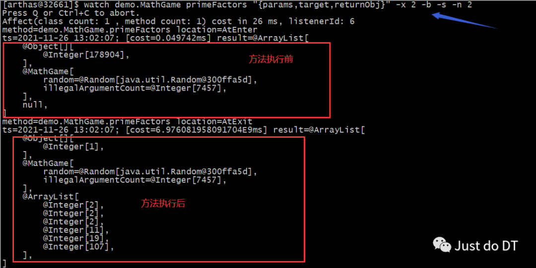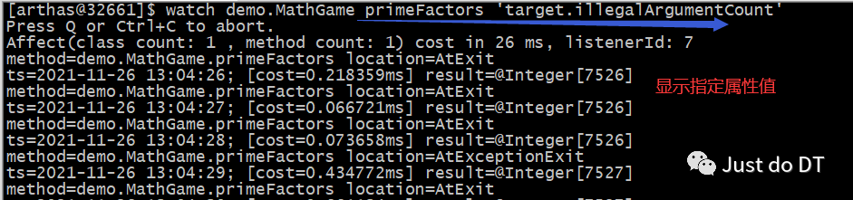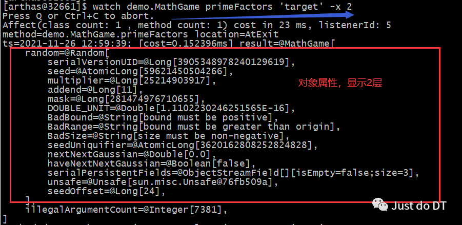 观察当前对象中的属性,如果想查看方法运行前后,当前对象中的属性,可以使用target关键字,代表当前对象watch demo.MathGame primeFactors 'target' -x 2