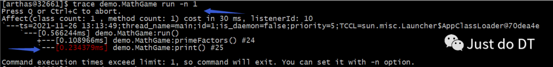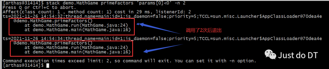 同时观察方法调用前和方法返回后,参数里-n 2,表示只执行两次。