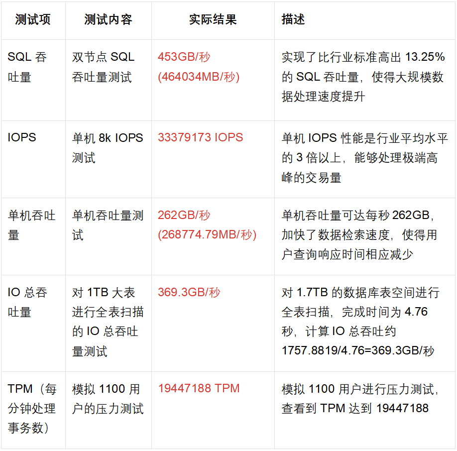 1 | 卓越的数据处理吞吐量: 系统在双节点SQL吞吐量测试中以453GB/秒的速度处理数据,超越行业标准及预期目标。单机环境下,吞吐量达到每秒262GB,用户查询响应时间减半,显著提升了用户体验。 |