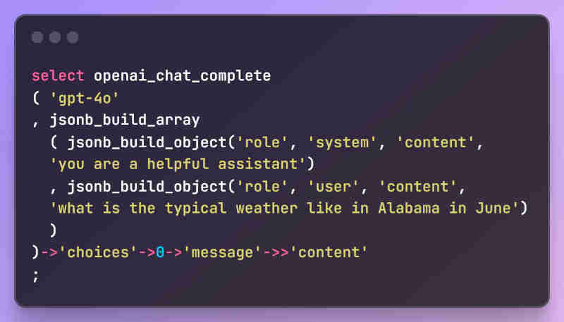 pgai 的初始版本支持创建 OpenAI 嵌入,并直接从您的 PostgreSQL 数据库从 GPT4o 等模型获取 OpenAI 聊天完成。计划是在未来增加对更多模型的支持,例如 Claude 和 Cohere。