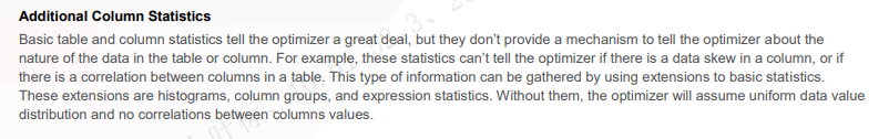 额外的列统计信息包括histograms, column groups, expression statistics.