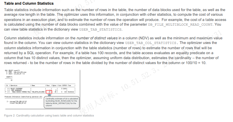 优化器统计信息会收集描述数据库和对象的相关信息。 这些信息用来为SQL 选择最优的执行计划。 统计信息保存在数据字典中,比如: USER_TAB_STATISTICS.
