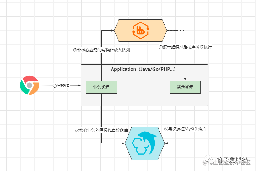 的写压力,能够将写压力控制到一个相较平缓的程度,防止由于大量写请求直接到达MySQL