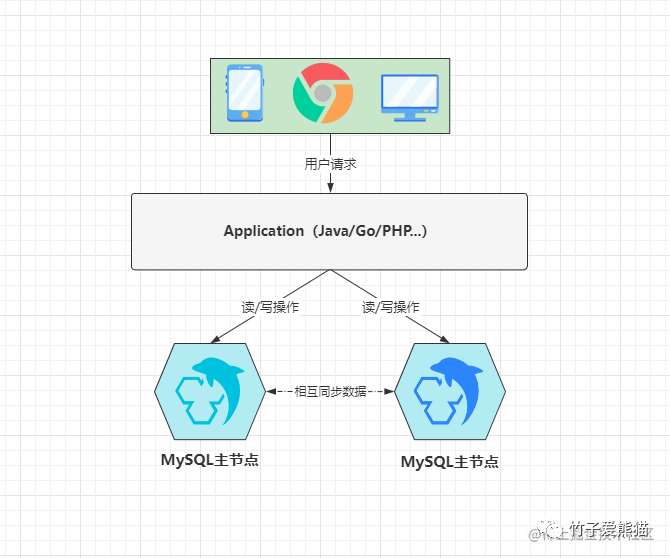 流量,因此对于这种场景下,双主双写(双主热备)方案才是最佳选择,其架构图如下: