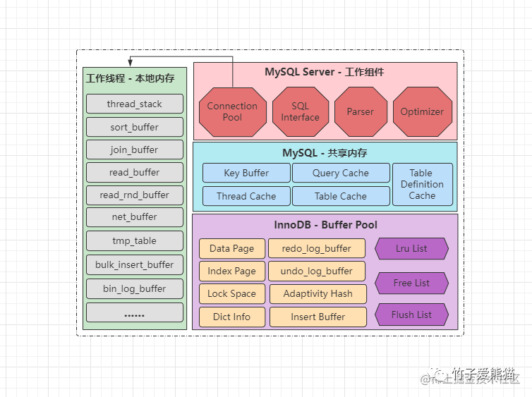 是什么?还记得咱们在《MySQL架构篇》中聊到的缓存和缓冲区么,其中所提到的写入缓冲区就位于Buffer Pool