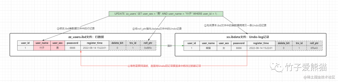 执行的流程如上图中的序号所示,当需要回滚事务时,直接用Undo