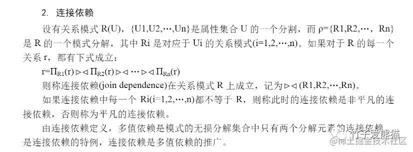 看不懂对不?说实话我也看着迷糊,大概能确定的是:多值依赖也属于连接依赖的一种,而连接依赖也包含了多值依赖,大家可以参考一下《这个》。