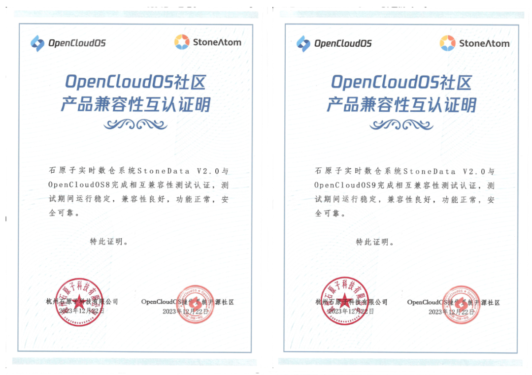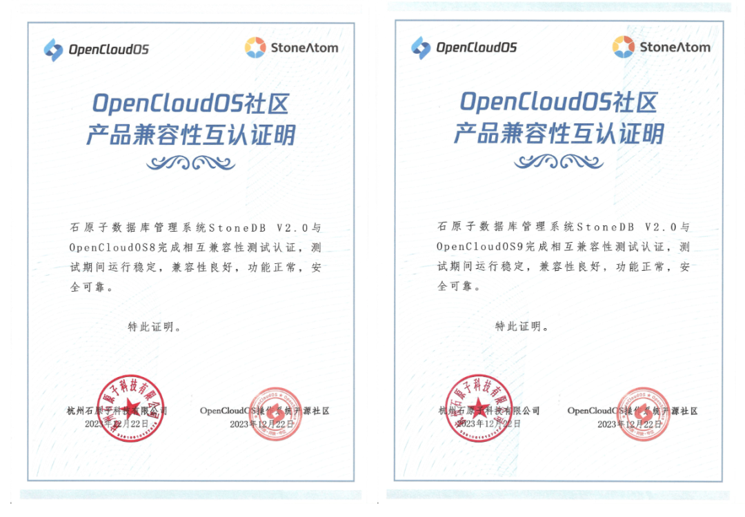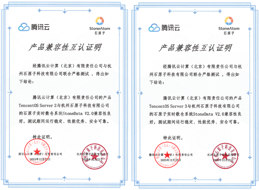 石原子数据库管理系统 StoneDB 单机版 V2.0 和石原子实时数仓系统 StoneDB 数仓版 V2.0 通过测试能够适配 OpenCloudOS Server 9 、TencentOS Server 2、TencentOS Server 3 操作系统,满足 OpenCloudOS社区、腾讯云和石原子科技的产品兼容性互认证要求,通过OpenCloudOS Server 9 、TencentOS Server 2、TencentOS Server 3 认证测试。
