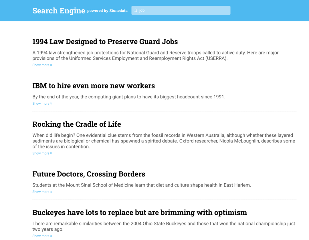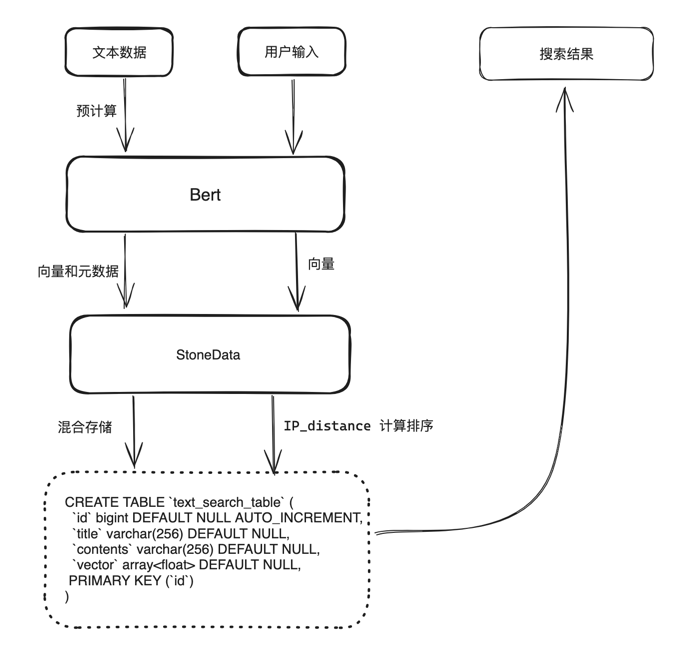 文本搜索是指根据文本的内容(例如关键词、语义等)来搜索的服务,是搜索引擎非常重要的一部分。 本示例使用 Stonedata 和 Bert 构建文本搜索引擎,使用 Bert 将文本转换为向量并存储在 Stonedata 中,然后结合搜索与输入文本相似的文本。