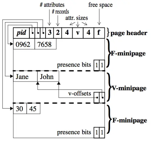 一般是将一行数据完整的从头到尾连续存储(超长的字段一般会单独存储,行内记录逻辑地址),连续多行构成一个页,页的尾部通常会存储索引来解决 record 不定长时的快速查找问题。