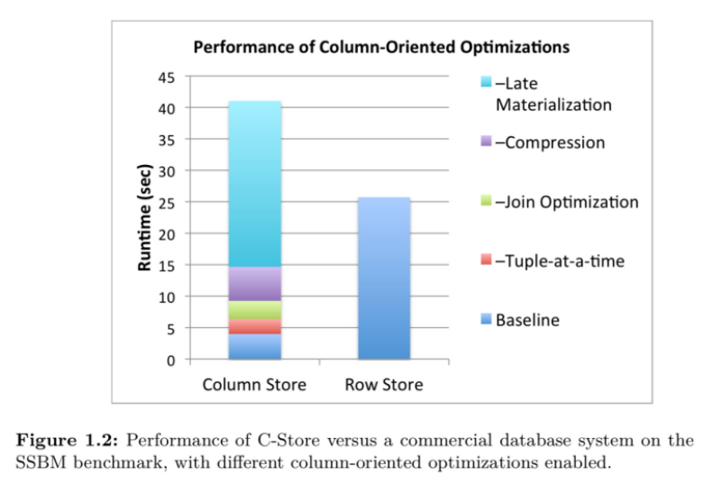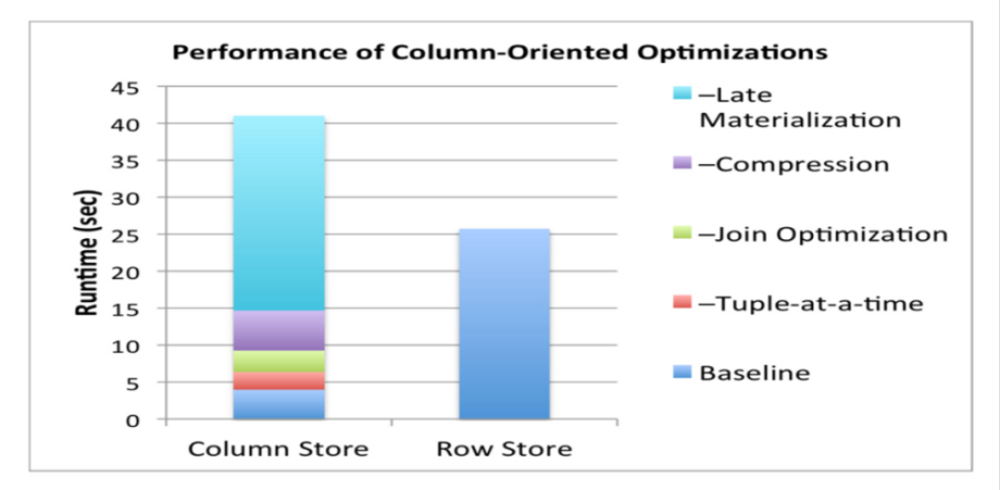 仅仅将数据存储在列中,并不足以让基于列的存储获得全部性能。该论文中花了大量篇幅来分析几个关键的列存数据库加速技术, 如下图所示