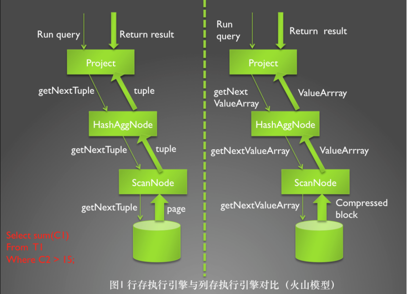 上图描述的就是火山模型实现的行存执行引擎与列存执行引擎,其中左边代表的是当前比较流行的传统行存火山模型,右边代表的是列存实现的火山模型,从上图我们可以看到火山模式是从执行计划树的根节点开始向叶子节点递归调用,然后有叶子节点,通常是各种的扫描节点返回一条符合过滤条件的 tuple 给上层节点处理,每一层节点在处理完该 tuple 之后继续网上层节点传递记录(Agg 节点不是立刻往上层节点返回数据,它需要计算完所有的 Tuple,才能继续往上层节点返回,所以这里 AGG 算子在处理好这个 Tuple 之后,又会往下调用扫描算子返回下一条符合过滤条件的记录)。这样处理完整个表的记录之后,AGG 算子会把数据返回到上一层节点继续处理,在整个过程中需要 AGG 算子缓存中间结果。右边列存执行引擎,执行逻辑基本上与左边行存执行引擎一致,但是每次扫描处理的是一组组以 col 组织的列数据集合,这样我们最为直观的观察就是从上层节点向下层节点的调用次数少了。相应的 CPU 的利用率得到了提高,另外数据被组织在一起。可以利用硬件发展带来的一些收益;如 SIMD, 循环优化,将所有数据加载到 CPU 的缓存当中去,提高缓存命中率,提升效率。在列存储与向量化执行引擎的双重优化下,查询执行的速度会有一个非常巨大的飞跃大约3-5倍。
