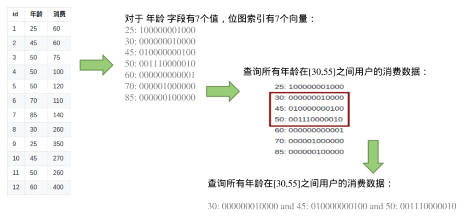 位向量编码是为每一个不同的取值生成一个位向量, 根据位向量( 串)中不同的位置取值 0 或 1来对应并确定不同的原始值。位向量编码算法其实就是位图索引算法,适用于低基数的列,相对于B树索引,它的count,and,or操作更有效,位图索引位存放的是0,1的 bit,相对于B树索引,占字节数特别少,不适合 update、insert、delete 频繁的列-因为要一个数据的更新可能会导致2个位图向量的更新。bitmap 的思想就是数据压缩。用一个二进制bit(0或者1)去标记某个元素对应的 value, 这就是 bit + map。适用于低基数的列,相对于B树索引,它对 count, and, o r操作更有效,位图索引位存放的是0,1的bit,相对于B树索引,占字节数特别少。不适合 update、insert、delete 频繁的列:因为一个数据的更新可能会导致2个位图向量的更新。 举例如下