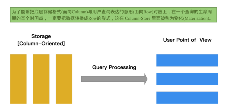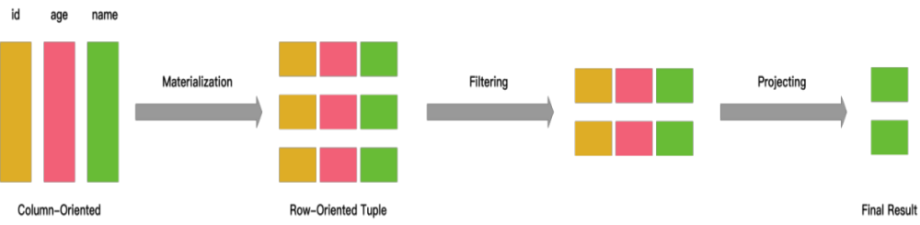 物化: 将列数据转换为可以被计算或者输出的行数据或者内存数据结果的过程,物化后的数据通常可以用来做数据过滤,聚合计算,Join