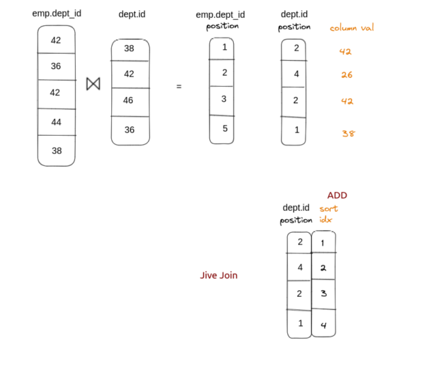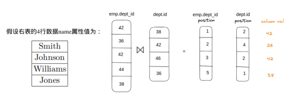 根据上面延迟物化部分我们可以已知,数据的查询过程中,我们先抽出 emp 表的 dept_id 和 dept 表的 id 列数据,进行匹配;并输出匹配结果对应原表的位置信息。(黄色文字部分是指 position 指向的值, 在实际 Join 中不会出现)